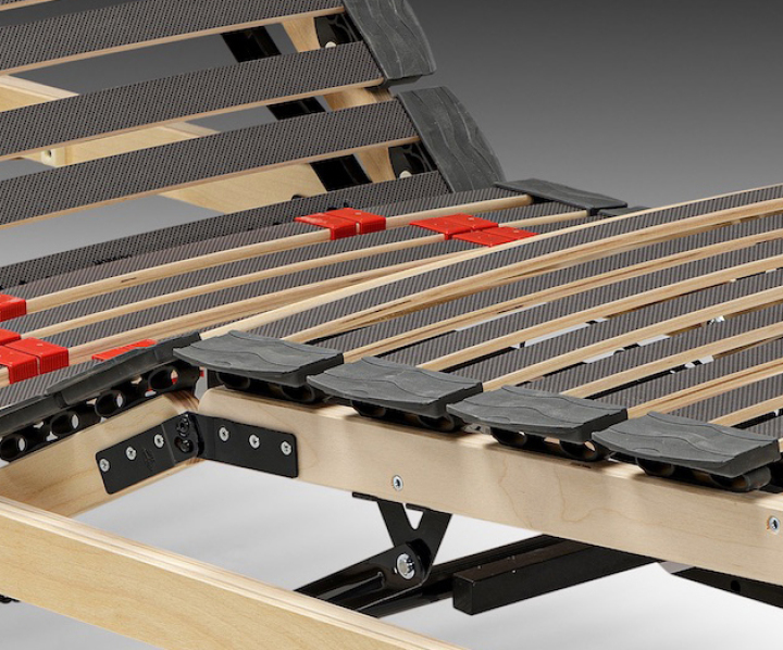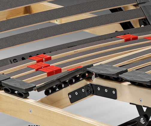 modello di rete dotato di doghe inserite in innesti a baloncelle in SEBS e di regolatori di rigidita' scorrevoli nella zono lombo-sacrale per consentire